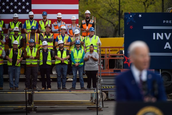 Union workers listen to U.S. President Joe Biden speak during a visit to Wolfspeed, a semiconductor manufacturer, as he kicks off his Investing in America Tour in Durham, N.C., on March 28.Melissa Sue Gerrits/Getty Images North America