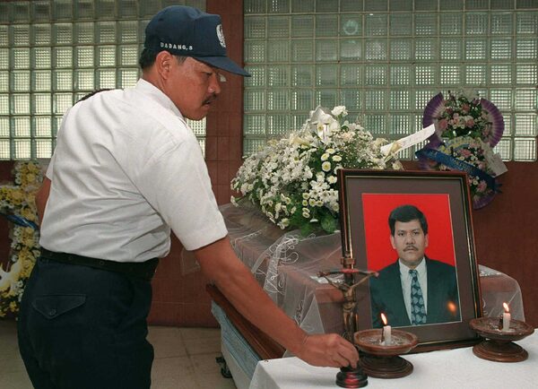 A guard adjusts the altar beside de Guzman's coffin at a Jakarta military hospital in 1997.Enny Nuraheni/REUTERS