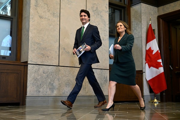 Prime Minister Justin Trudeau and Deputy Prime Minister and Minister of Finance Chrystia Freeland are pictured before the tabling of the Federal Budget in the House of Commons on Parliament Hill in Ottawa, on March 28.Justin Tang/The Canadian Press
