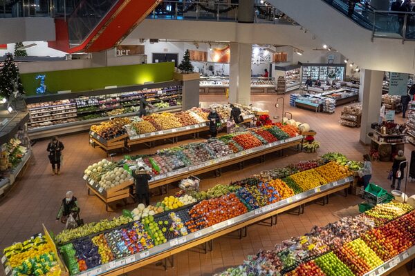 People shop at a grocery store in Toronto, on Nov. 22, 2022. Food inflation appears to be easing in Canada but experts say consumers shouldn't expect lower prices at the grocery store.CARLOS OSORIO/Reuters