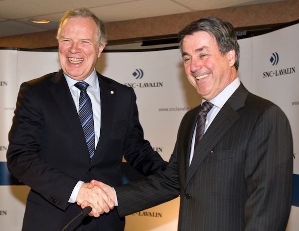 SNC Lavalin outgoing president and CEO Jacques Lamarre, left, shakes hands with his successor Pierre Duhaime on March 6, 2009, in Montreal.Paul Chiasson/The Canadian Press