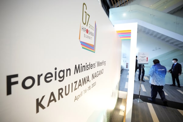 The sign of the G7 Foreign Ministers’ Meeting is seen at the media center prior to the meetings April 15, 2023, in Karuizawa, a resort town, north of Tokyo.Eugene Hoshiko/The Associated Press