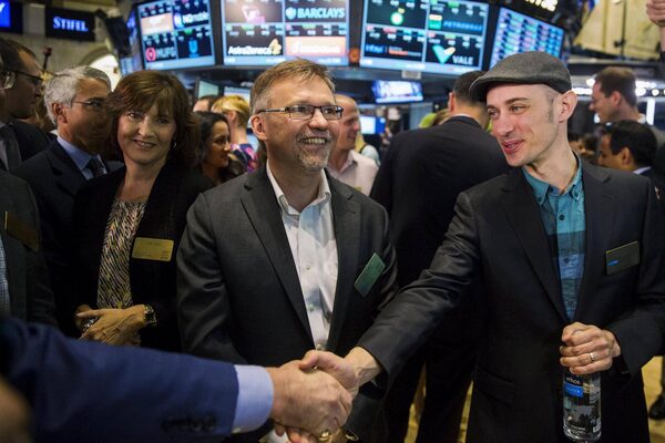 Former Shopify CFO Russ Jones, centre, on the floor of the New York Stock Exchange after the company's IPO in May, 2015. Mr. Jones is now an adviser to Georgian.LUCAS JACKSON