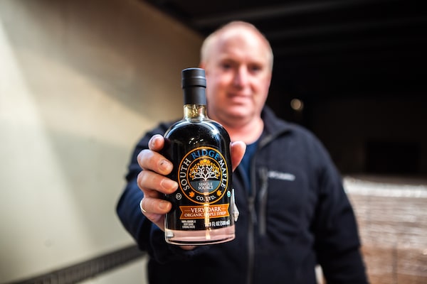 Zak Hargrove, co-owner of South Ridge Maple, holds a bottle of maple syrup at one of his warehouses in Knowlesville, N.B.Chris Donovan/The Globe and Mail