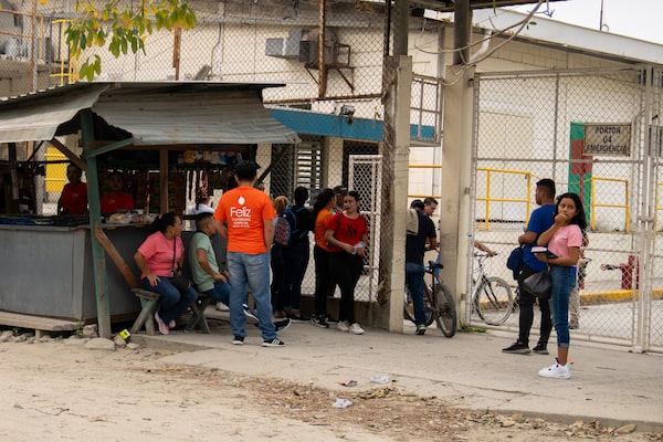 Factory workers line up outside a textile factory at the start of the day shift in the industrial sector where transnational textile companies, such as Gildan, operate their plants in Choloma, Honduras, on May 9.Tomas Ayuso/The Globe and Mail