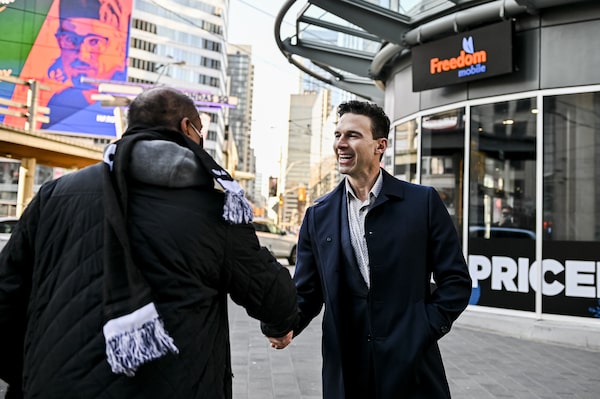 Former founder and CEO of Freedom Mobile Anthony Lacavera is greeted by a Freedom Mobile employee in front of a store in Toronto, on Dec. 13, 2021.Christopher Katsarov/The Globe and Mail