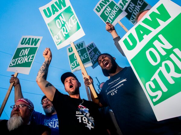 General Motors employees Bobby Caughel, left, and Flint resident James Crump, shout out as they protest with other GM employees, United Auto Workers members and labor supporters outside of the Flint Assembly Plant on Monday, Sept. 16, 2019 in Flint, Mich.Jake May/The Associated Press