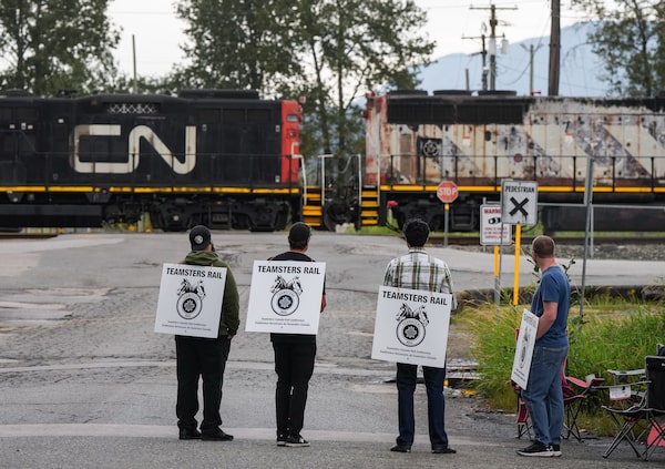 Locked out Canadian National Rail workers stand at a picket line as locomotives are moved by management at CN Rail's Thornton Yard, in Surrey, B.C., on Aug. 22.DARRYL DYCK/The Canadian Press