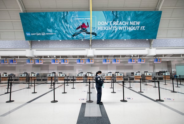 A worker stops to check their mobile device in departures area of Terminal 3 around noon at Toronto Pearson International Airport on July 14 2020.Fred Lum/The Globe and Mail