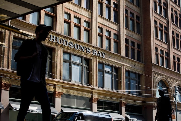 Pedestrians walk in front of Hudson's Bay Company's department store in Toronto on June 10, 2020.Cole Burston/COLE BURSTON/THE GLOBE AND MAIL