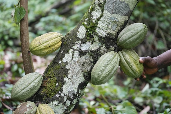 A farmer checks cocoa pods at his farm inside the conservation zone in the Omo Forest Reserve, in Nigeria, on Aug. 2, 2023.Sunday Alamba/The Associated Press