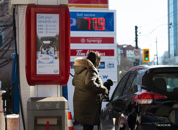 A women fills her vehicle with gas as prices dropped overnight in Toronto on March 18, 2020.Nathan Denette/The Canadian Press