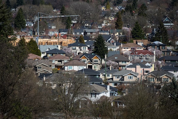 A condo building is seen under construction surrounded by houses in Vancouver, B.C., on Friday March 30, 2018.DARRYL DYCK/The Canadian Press