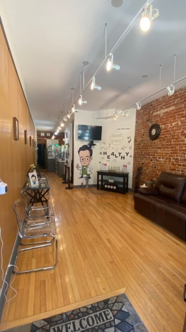 The waiting room at Mister Pharmacist in Toronto is complete with hardwood floors, a comfy couch, and a fridge stocked with free refreshments.MISTER PHARMACIST
