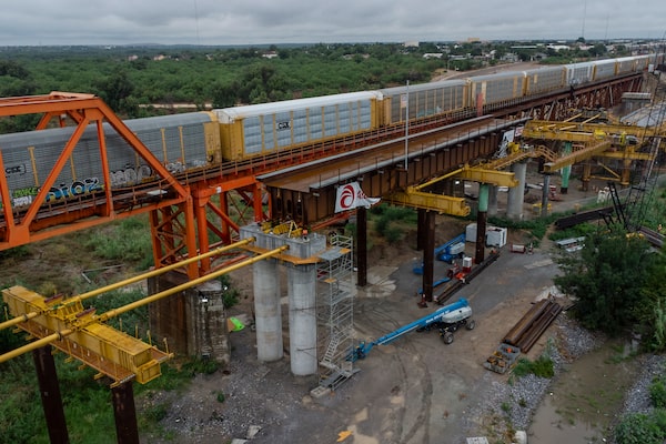 A freight train crosses the Patrick J. Ottensmeyer International Railway Bridge. The bridge's second track, seen under construction in May, 2024, has since been completed, more than doubling capacity at the border according to CPKC.Alejandro Cegarra/The Globe and Mail