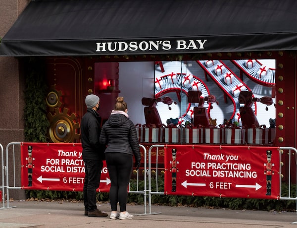 Pedestrians outside the Hudson’s Bay flagship store in Toronto on Dec. 10, 2020.Aaron Vincent Elkaim/The Globe and Mail