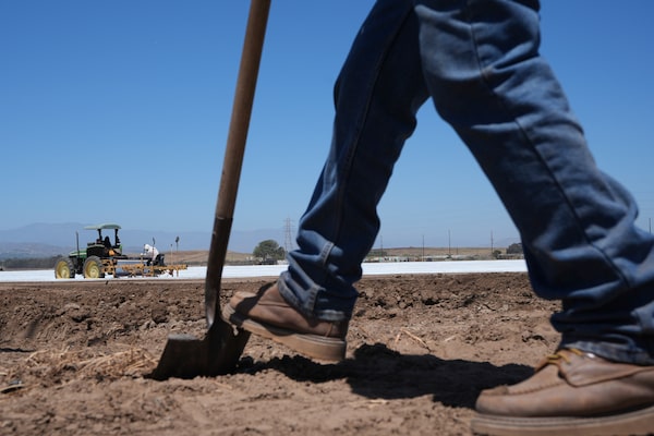 A farm worker checks the land as workers plow a strawberry field in Oxnard, Calif., on Wednesday, June 18, 2025. (AP Photo/Damian Dovarganes)Damian Dovarganes/The Associated Press