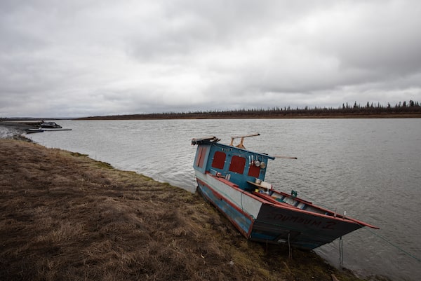 A fishing boat sits on the bank of the Mackenzie River in Northwest Territories on Sept. 30. Low water levels have left barges unable to traverse the river.JASON FRANSON/The Canadian Press