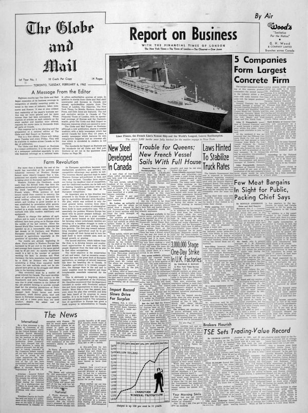 The Globe debuted a new, stand-alone section: Report on Business. For a modern audience, accustomed to colour photos and graphics, the ROB’s grey front page was a slog. It relied on data-driven stories – “TSE Sets Trading-Value Record” one headline read – anchored by a feature on a five-way merger among concrete producers. The only light touch was a photo of the latest French cruise ship, over the headline, “Trouble For Queens,” a reference to Britain’s luxury liners.