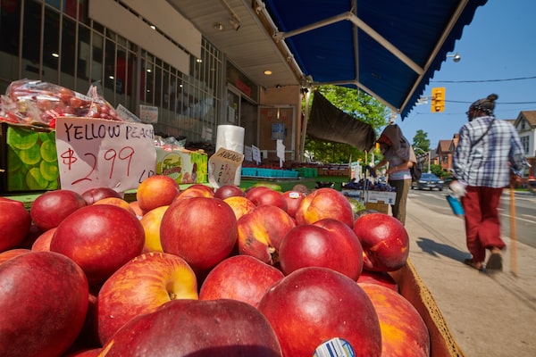 Pedestrians pass by fresh fruit laid out at Wellesley Fruit Market in downtown Toronto on June 20.Sammy Kogan/The Globe and Mail