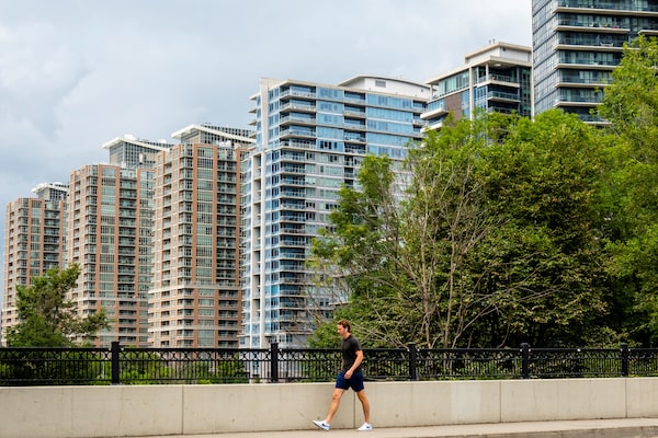 A pedestrian walks past condo buildings in the Liberty Village neighbourhood in Toronto, Ontario, Canada July 13, 2022.CARLOS OSORIO/Reuters