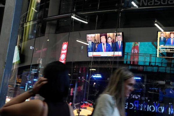 People walk in front of television screens displaying U.S. President Donald Trump's address to the nation, on Saturday.Eduardo Munoz/Reuters