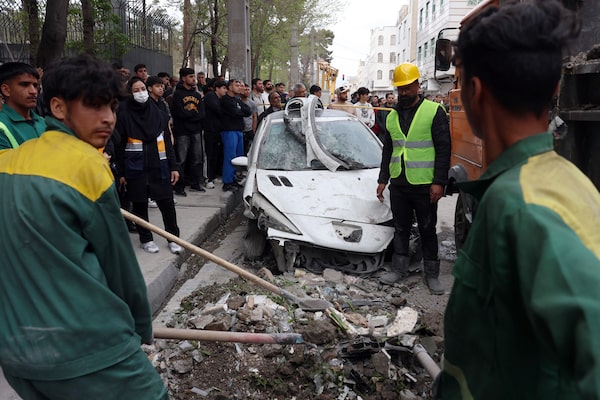 People gather as workers remove the wreckage of a car outside a residential building that was targeted in southern Tehran.-/AFP/Getty Images
