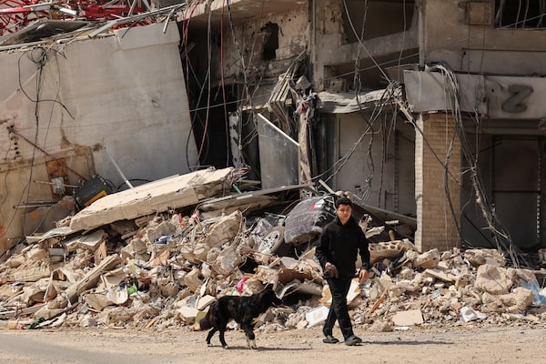A boy walks with a dog along the rubble of a building damaged in an Israeli strike in Tyre, Lebanon.Yara Nardi/Reuters