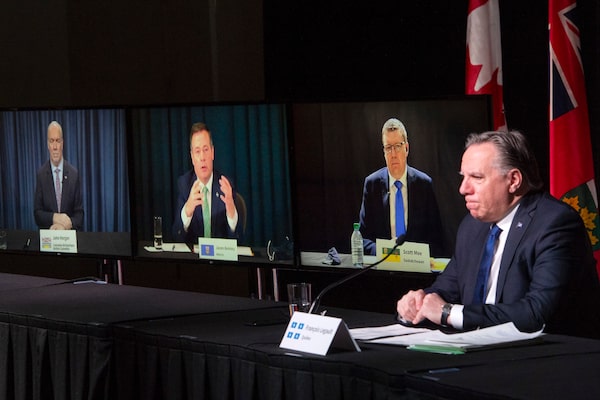 Quebec Premier Francois Legault chairs a premiers virtual news conference with premiers John Horgan, B.C., Jason Kenney, Alberta, and Scott Moe, Saskatchewan, onscreen, on March 4, 2021 in Montreal.Ryan Remiorz/The Canadian Press