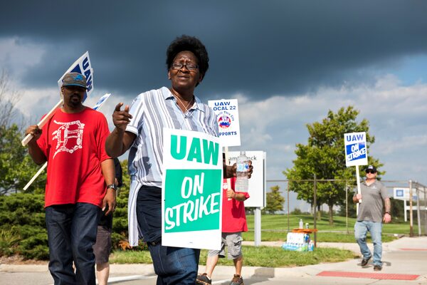 Linda Crooks, who has worked for General Motors for 35 years, walks with other picketers outside the Detroit-Hamtramck General Motors assembly plant, on Sept. 16, 2019.Emily Rose Bennett/The New York Times News Service