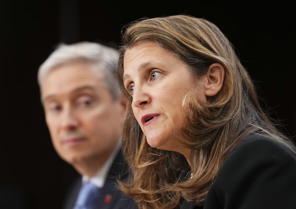 Finance Minister Chrystia Freeland, right, with Innovation, Science and Industry Minister Francois-Philippe Champagne, announces several steps the federal government is taking to make banking more affordable during a news conference in Ottawa on Oct. 17.Sean Kilpatrick/The Canadian Press