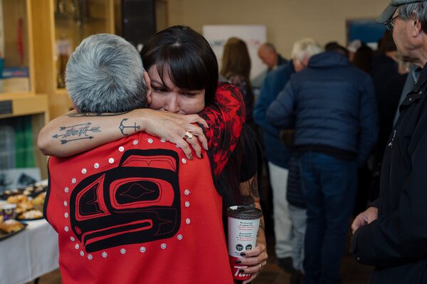 Haisla chief Crystal Smith, left, hugs her aunt, elder Marilyn Furlan, during an event celebrating the newly funded LNG export facility on Oct. 6, 2018. Chief Smith says she is overjoyed to finally have the ability to move forward.Amber Bracken/The Globe and Mail