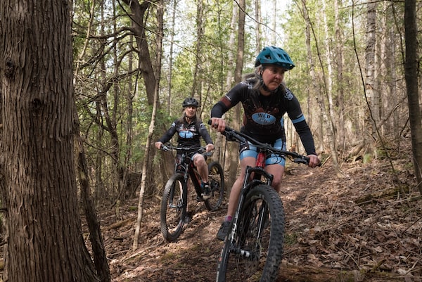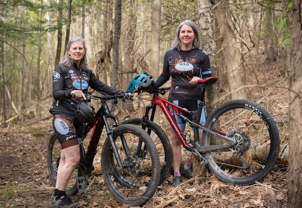 Melinda Davie (left) and Isabelle Faucher of the Wild Bettys stop for a moment along the bike trail on Ms. Davie's property in Mono, Ont.Tijana Martin/The Globe and Mail
