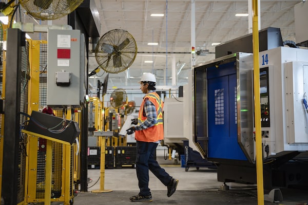 Electric vehicle battery trays are milled while at Magna's Heart Lake production facility, where they are currently manufacturing battery enclosures for Ford F-150s, in Brampton, Ont., on Aug. 3.Christopher Katsarov/The Globe and Mail
