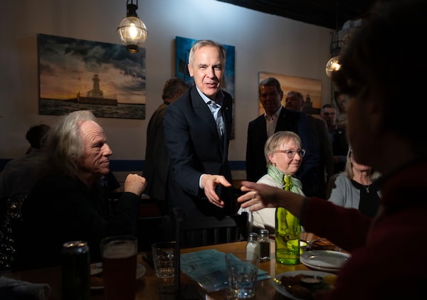 Liberal Leader Mark Carney greets patrons at a restaurant during a federal election campaign stop in Port Colborne, Ont., on April 18.Christinne Muschi/The Canadian Press