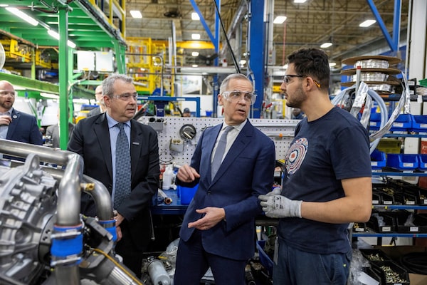 Mark Carney speaks with an employee while touring the factory floor with Paul Le Houillier, President of Nova Bus, before making an announcement during his Liberal Party election campaign tour at Nova Bus, in Saint-Eustache, Que., on April 15.Carlos Osorio/Reuters
