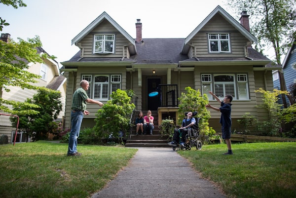 Maarten Mulder, left, and his son Ian Mulder, right, 11, toss a frisbee around as his wife Wendy Hales, daughter Elleke Mulder, 12, and son Tom Mulder, 14, sit and watch at their home in Vancouver, on Wednesday June 6, 2018. Darryl Dyck/The Globe and MailDARRYL DYCK/Globe and Mail