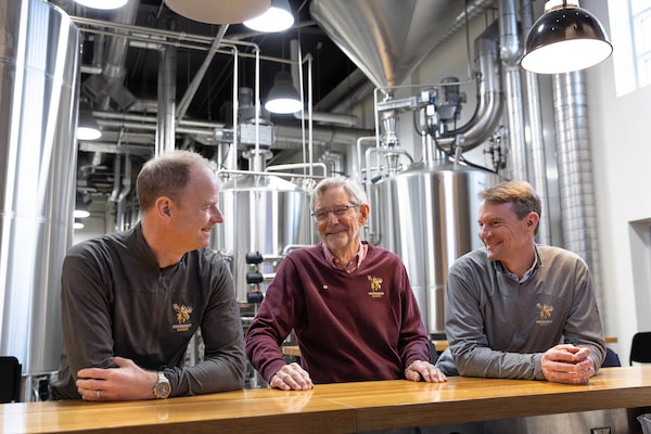 Derek Oland, centre, took the opposite approach of his father’s “sink or swim” style of mentorship when it came to bringing his sons Patrick, left, and Andrew into the family business.Supplied