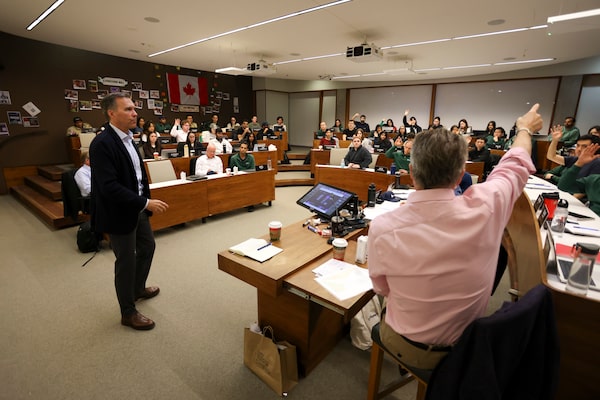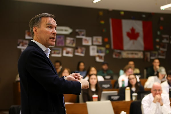 Former Finance Minister Bill Morneau discussed the high-pressure 2018 Trans Mountain negotiations with MBA students at Western University during a Lessons from CEOs on Managing Strategic Transformation class, on Nov. 19.Nicole Osborne/The Globe and Mail