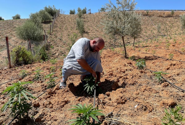 Abderrahman Talbi checks on cannabis plants at a field near Bab Berred earlier this month. Like many farmers, Talbi is relieved to no longer have to worry about raids and seizures.AHMED ELJECHTIMI/Reuters