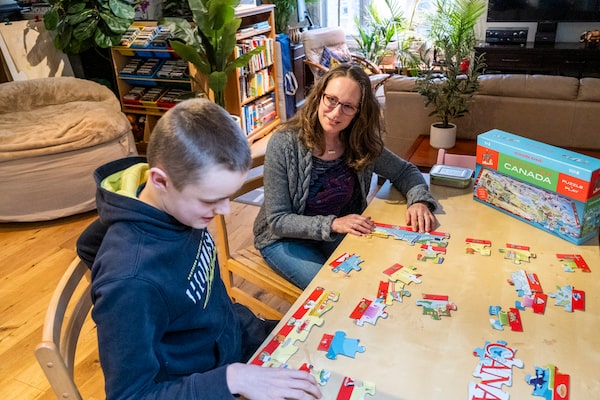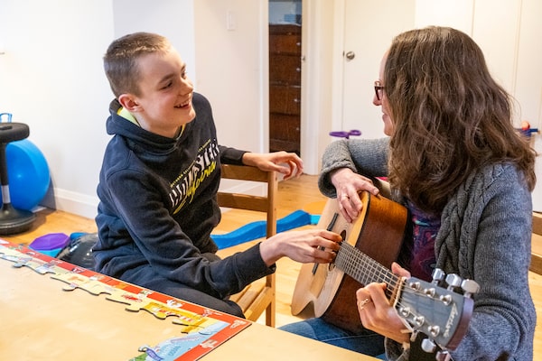 Dr. Janet McLaughlin, associate professor of health studies at Wilfrid Laurier, encourages her autistic son Sebastian to strum on the guitar while singing at their Waterloo home.Alicia Wynter/The Globe and Mail