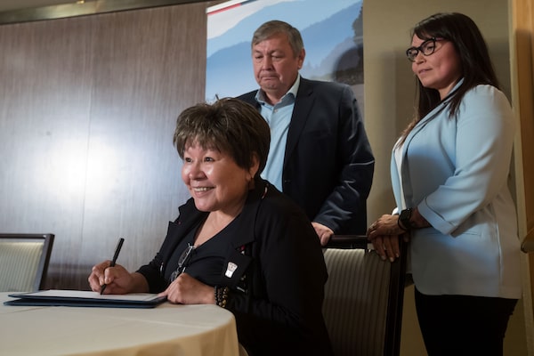 A memorandum of understanding on a First Nations collaborative climate initiative signed by Eva Clayton, President of the Nisga'a Lisims Government, left, then-Mayor of Lax Kw'alaams John Helin, centre, and Haisla Nation Chief Councillor Crystal Smith, right, during a news conference, in Vancouver, on Oct. 9, 2019.DARRYL DYCK/The Globe and Mail