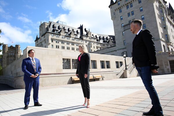 Coalition of Hardest Hit Businesses members from left: Keith Henry, CEO of the Indigenous Tourism Association of Canada, Barbara Barrett, executive director of Frontier Duty Free Association and Martin Roy, executive director of Festivals and Major Events Canada.Dave Chan/The Globe and Mail