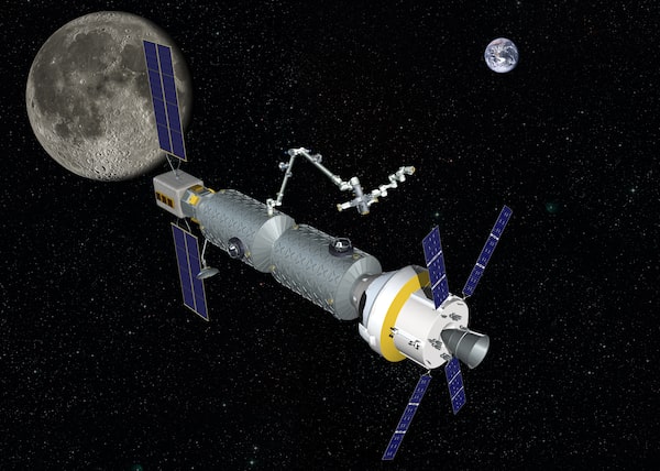 A rendering of the Lunar Gateway, which will be assembled with the Canadian-made Canadarm3 – lighter, smaller and faster-moving than its predecessors, the Canadarm and Canadarm2.Courtesy NASA