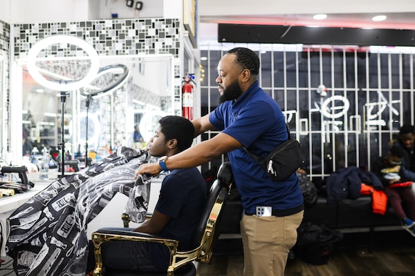 Sheldon Walker gives 15-year-old Khaleel English a haircut at Klean Kut Barbershop in Scarborough on Jan. 6.Christopher Katsarov/The Globe and Mail
