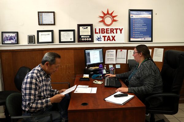 A Liberty Tax Service specialist helps a client file his taxes, in Oakland, Calif., on April 16, 2018.Justin Sullivan/Getty Images