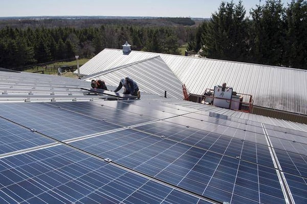 Workers from Osborne Solar Solutions install a new solar panel array in Scugog, Ont.The Canadian Press