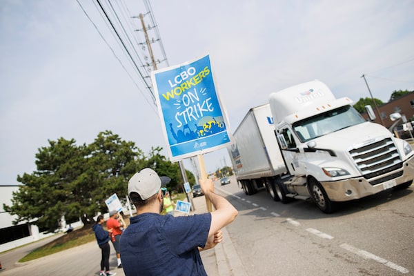 Workers and supporters hold a picket line outside the LCBO distribution centre in Mississauga, Ont. as OPSEU union members continue their strike on July 9.Cole Burston/The Canadian Press