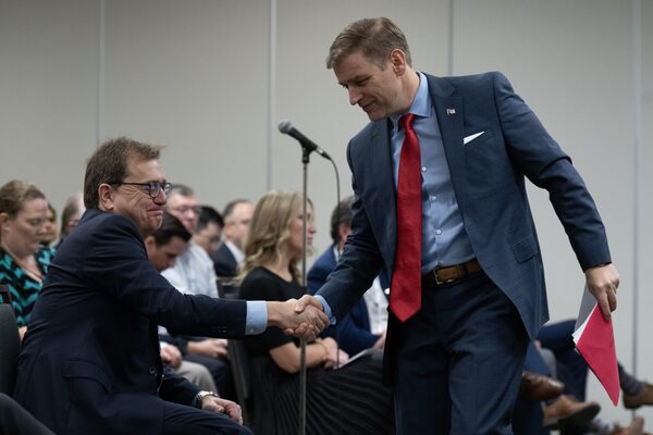 Newfoundland and Labrador Premier Andrew Furey, right, shakes hands with Energy and Natural Resources Minister Jonathan Wilkinson after speaking at an announcement, on Dec. 6, in Ottawa.Adrian Wyld/The Canadian Press
