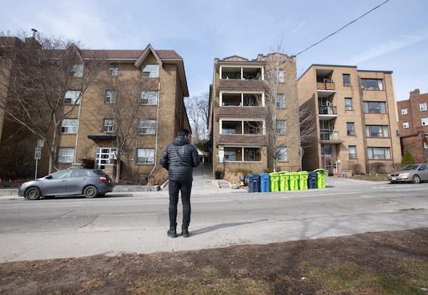 Pedestrians walk past apartment rental buildings in Toronto on Mar 11, 2024.Fred Lum/The Globe and Mail